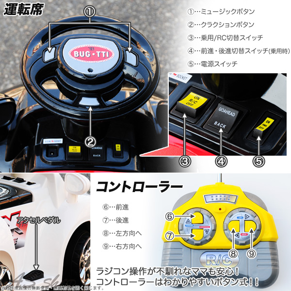 サラウンド機能も充実! 前進・後進・右折・左折のフルアクション 保護者からのラジコン操作も可能で安心!! 電動乗用ラジコンカー ロードカータイプ